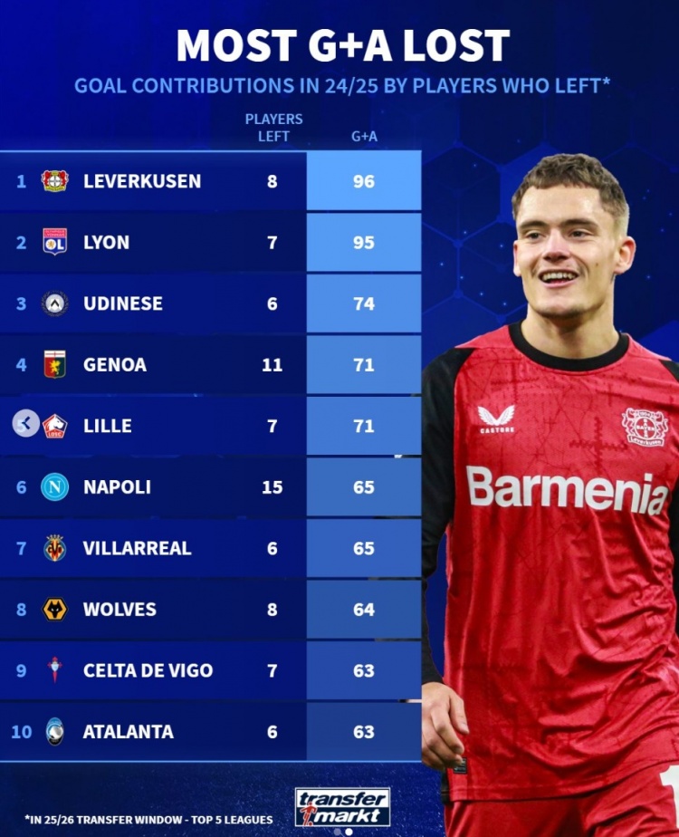 7月26日讯 《转会市场》统计了今夏各队离队球员在上赛季的直接参与进球情况,勒沃库森和里昂失血最为严重。