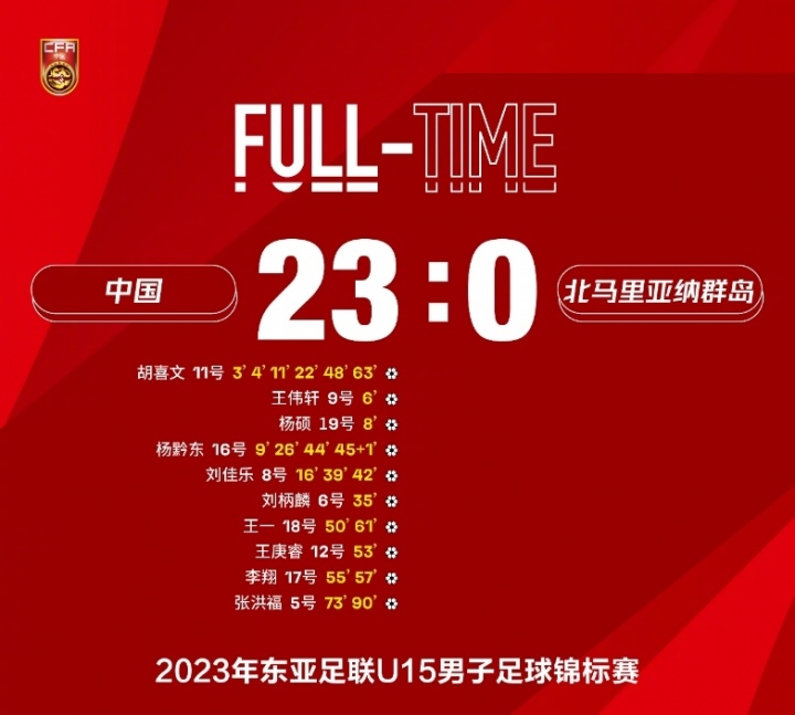 2023年,东亚足联U15男子足球锦标赛,中国23-0北马里亚纳群岛
