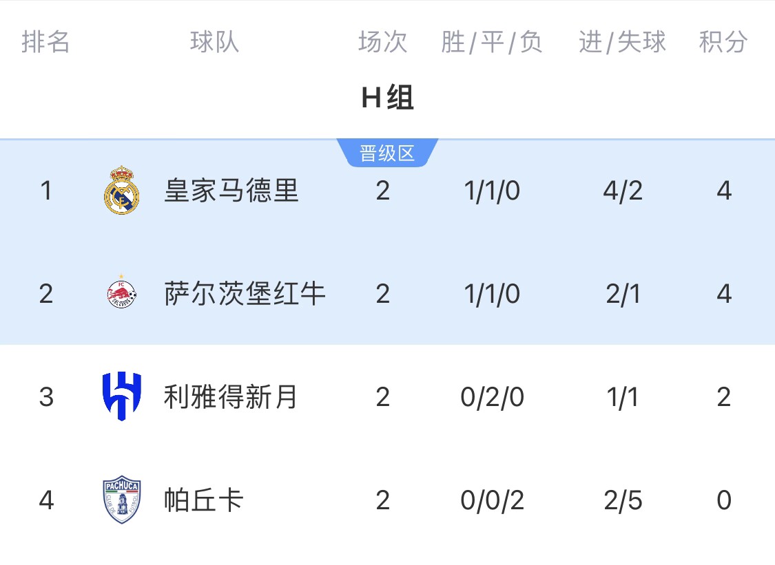 06月23日讯 H组前两轮比赛打完,帕丘卡出局,末轮皇马vs萨尔茨堡红牛,利雅得新月vs帕丘卡。如果新月末轮不胜,皇马、萨尔茨堡红牛携手晋...